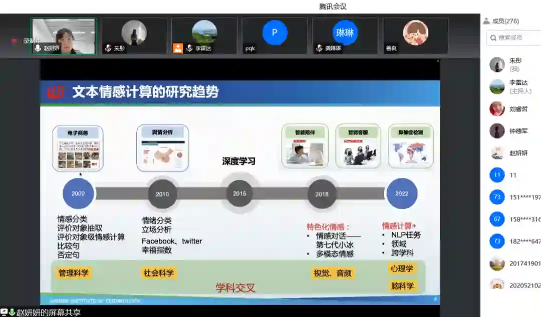哈尔滨工业大学赵妍妍副教授作了题为“文本情感分析”的讲座,详细介绍了文本情感计算近年来的研究趋势和研究思路,展望了文本情感计算与多学科多领域交叉的研究任务,并在讲座中展示了丰富的实际应用案例。