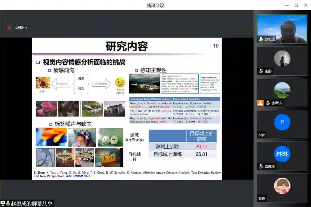 美国哥伦比亚大学赵思成博士后作了题为“视觉内容情感分析”的讲座,总结了视觉情感分析的研究现状、应用场景以及目前面临的挑战,从共性语义理解、个性化感知预测与标签分布学习、有限标注机器学习三个方面总结了现有的工作。