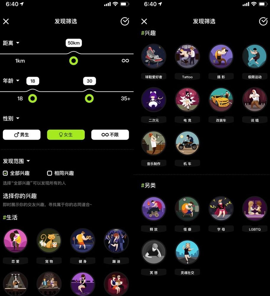 也有人更希望在遇到大海捞月般的少数同道人,积目就列出了tattoo、蹦迪、改装车、极限运动、冥想等标签。此外,类似Blued这样的同性社交也是约会App中不可或缺的类型。