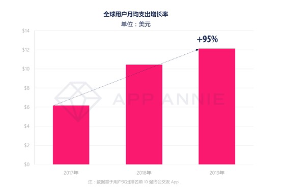 App Annie数据显示,自 2012 年起,全球 iOS 和 Google Play 上交友类 App 的下载量累计达到 17 亿次。与此同时,在 2019 年,交友类 App 的全球用户支出达到了 22 亿美元,与 2 年前相比翻了一倍。同样的增长情况也体现在单一用户身上,相比于 2017 年,2019年的全球月均用户支出增长率高达 95%。