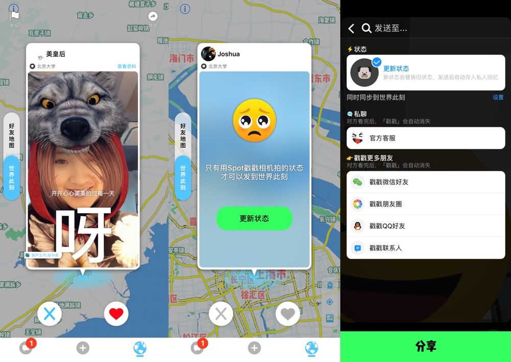 例如,有人更看重开启一段感情的安全性。Spot戳戳就鼓励用户接入通讯录、微信、QQ等平台的关系链,并引入Facebook、人人一样的校友功能。用户导入维度越丰富,系统就能沿着关系链做出更真实可靠的推荐。当然Spot戳戳的表情包、即刻分享等功能又保证了趣味性和简单上手。