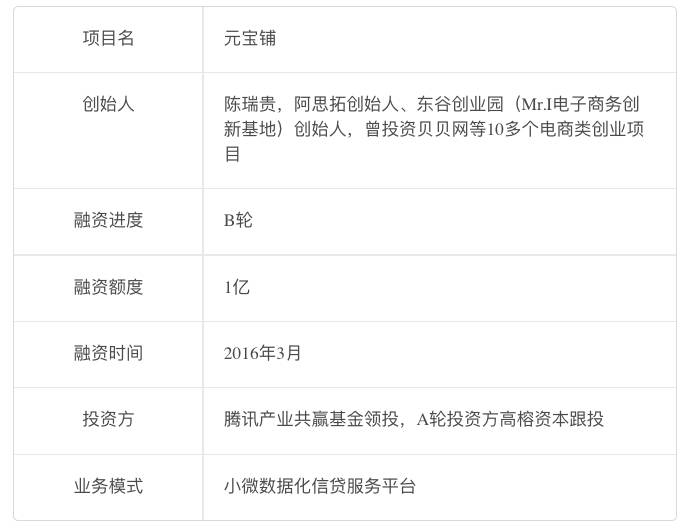 多次沟通后,陈瑞贵确认银行并不排斥腾讯,“对他们态度很温和”。因此,去年3月,元宝铺获得由腾讯产业共赢基金领投的1亿元B轮融资,其中A轮投资方高榕资本跟投。