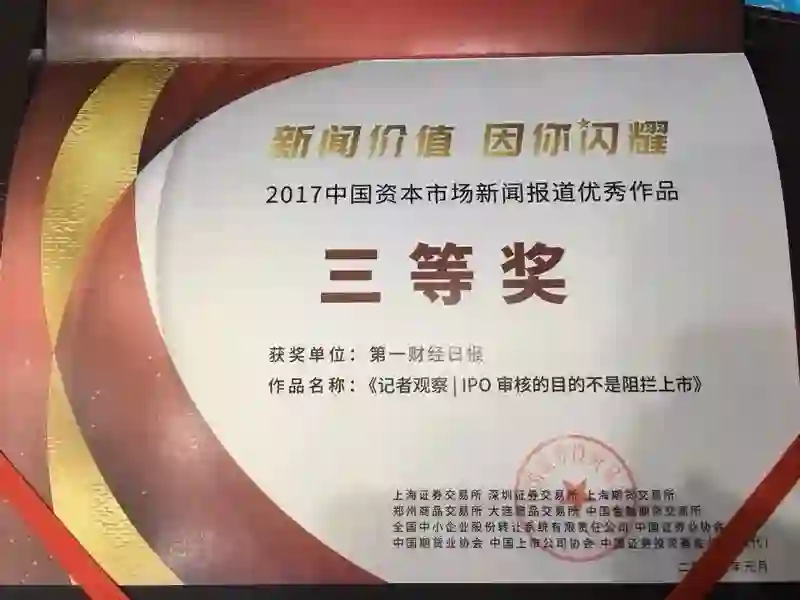 第一财经选送的三件作品获奖,其中一件作品获得一等奖、两件作品获得三等奖,彰显了第一财经在资本市场新闻报道方面的专业度和影响力。这三篇作品分别是:《并购重组市场悄然升温 开启存量资产优化时代》(一等奖;作者:周楠)、《记者观察 | IPO审核的目的不是阻拦上市》(三等奖;作者:杜卿卿)、《稽查重拳出击 为市场正本清源》(三等奖;作者:沈旭、袁玉立)。