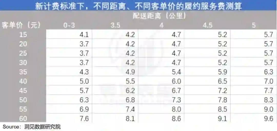 进一步对美团的配送收费标准测算,可以看到:30元以内的外卖,配送费在3.7-5.7元;35-50元,配送费为4.3-8.3元。