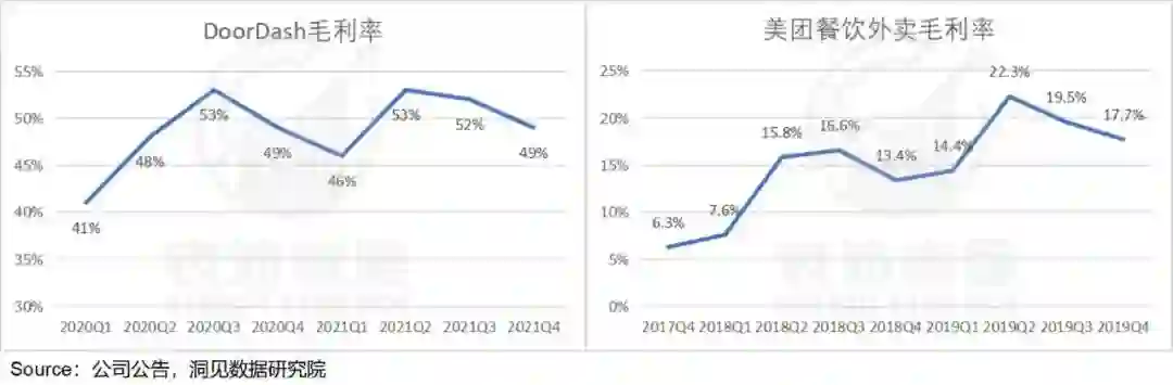 承担配送费的载体不同,导致的结果呈现在数据上就是,Doordash的毛利率要远高于美团。