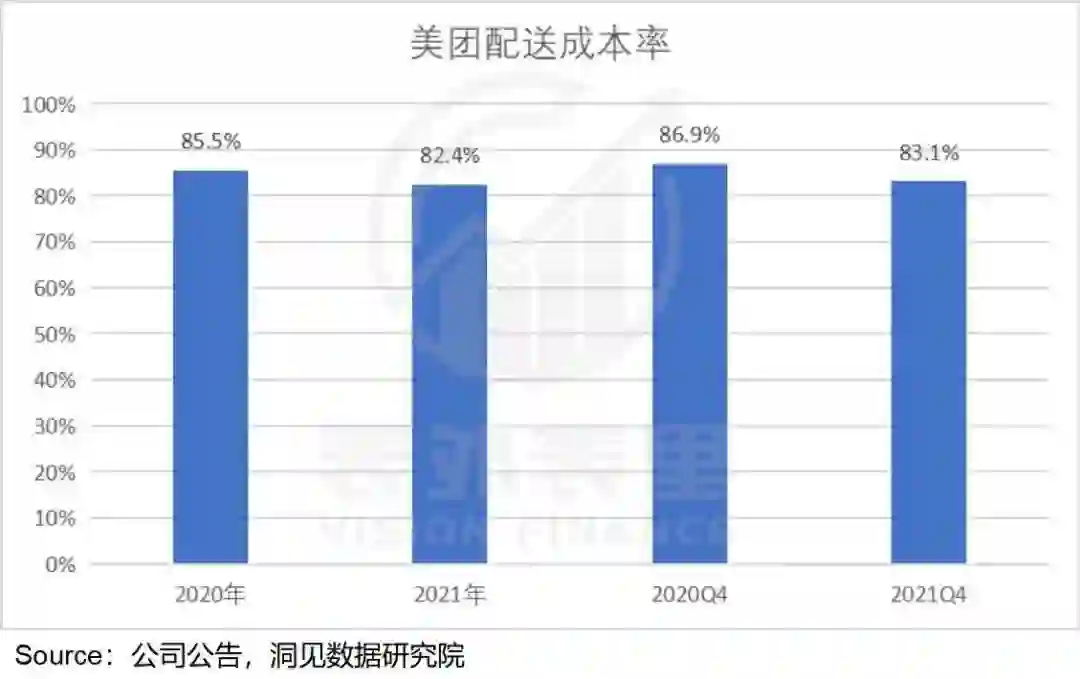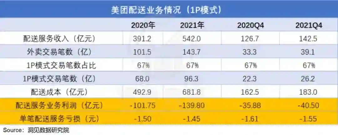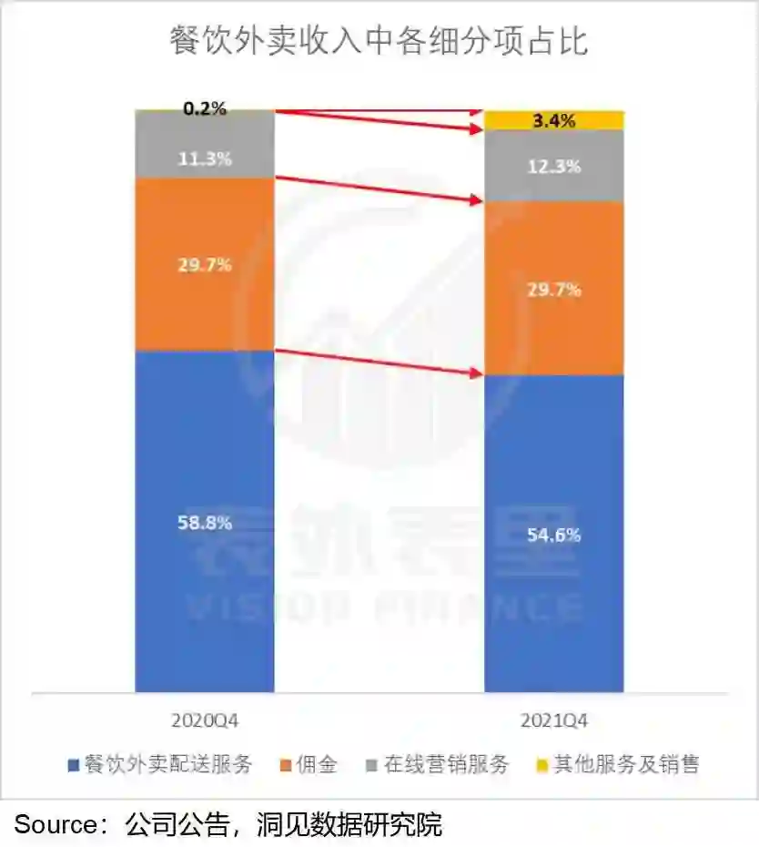 而从数据上看,配送服务收入占餐饮外卖总收入的大头,2021Q4占比为54.6%,收入约为143亿。