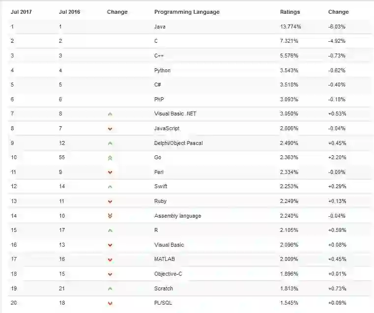 看看还有多少人依然坚守在 Java 的针线上。TIOBE 发布了 7 月编程语言排行榜,Go 语言今年一路飙升,终于在 7 月进入前 10 名。相比之下, Kotlin,Elixir 和 Hack 作为三门新兴语言本月排名并未提升。值得注意的是,“老将” Java 虽然仍稳稳占据着榜首位置,但却下滑了6.03%,为本次跌幅最大的编程语言。