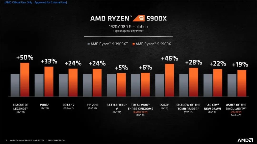 本周四,AMD 发布了新一代的桌面处理器产品——Ryzen 5600X、5800X、5900X、5950X。AMD 表示,AMD 锐龙 9 5900X 处理器和上代产品相比,在选定游戏中性能提升高达 26%。