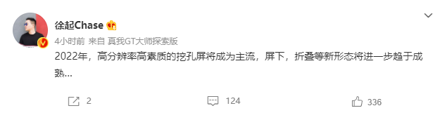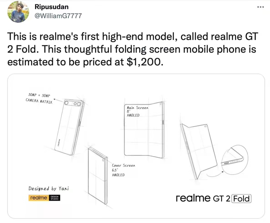 realme 副总裁、中国区总裁徐起今天发微博表示,2022 年高分辨率高素质的挖孔屏将成为主流,屏下,折叠等新形态将进一步趋于成熟。此外,海外博主 @WilliamG7777 今日爆料,realme 要冲击高端市场,而且要进军折叠屏手机领域,价格可能在 1200 美元以上(约合人民币 7700 元)。