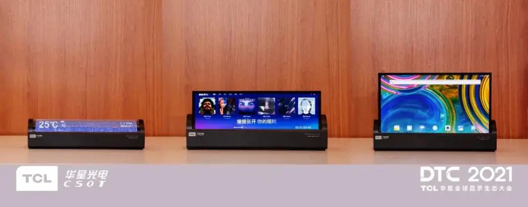 14" 喷墨打印 OLED 卷轴屏,可以自由变换多种形态,数字显示闹钟、音乐播放器、显示器,多种应用形态无缝切换,由 TCL 华星跟日本 JOLED 合作推出;