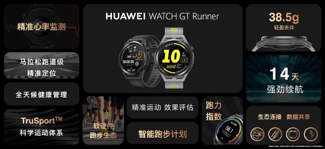 华为 WatchGT Runner 采用精密陶瓷表圈及钛金属表冠,表体选取轻量材质,外观更有速度感设计加持。该手表采用了隐藏式悬浮外置天线,实现双频五星精准定位,并且根据历史数据分析和定制训练目标,可智能评定跑步等级,提供个性化科学训练计划。华为 WatchGT Runner,支持多种专业运动设备连接,强劲续航,典型场景最长续航 14 天。华为 WatchGT Runner 提供了星夜跑者、黎明之晖,售价为 2188 元。