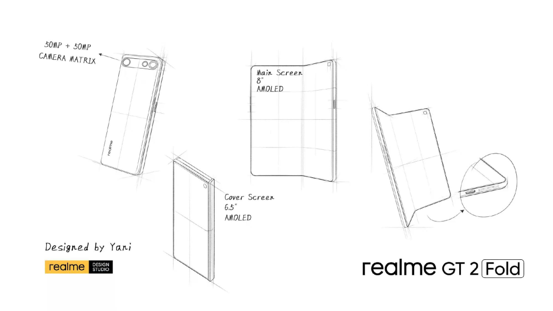 该博主曝光了一张 realme 折叠屏手机渲染图,该机型命名为 realme GT 2 Fold,采用左右式折叠方案,内屏 8 英寸 AMOLED,外屏 6.5 英寸 AMOLED,配备 50+50MP 镜头模组,与三星 Galaxy Z Fold3 一样。不过设计上不同之处在于,realme 折叠屏的小屏在右侧位置,与三星 Galaxy Z Fold3 的小屏位置恰好相反。而且这款 realme GT 2 Fold 主屏和小屏都是采用挖孔屏方案。