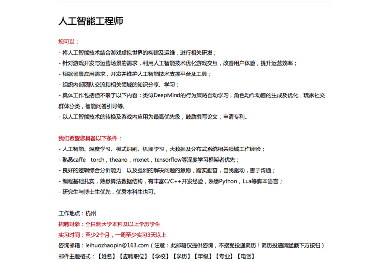 从网易游戏近期公布的招聘职位也能看出这种趋势。比如网易游戏旗下的雷火游戏部招聘的人工智能工程师的工作职责就包括了“类似DeepMind的行为策略自动学习,角色动作动画的生成及优化,玩家社交群体分类,智能问答引导等”。