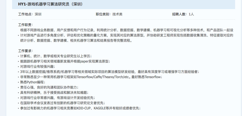根据腾讯最新的招聘信息,也有招聘游戏机器学习算法研究员、工程师。其中工作职就包括:根据不同游戏业务数据、用户反馈和用户行为记录,利用统计分析、数据挖掘、数学建模、机器学习和可视化分析等多种技术,和产品团队一起设计对游戏产品进行多角度分析、评估和优化策略的量化方案,实现其对应的算法原型,并协助研发工程师实现包括数据收集清洗、特征提取对应的统计分析、数据挖掘、数学建模、相关机器学习算法和结果报告等完整流程。