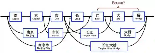 Lattice-LSTM [24] 将句子表示为由其中的词汇和字构成的 Lattice 结构(见下图)。在基于字序列的 LSTM 基础上,Lattice-LSTM 仿效 LSTM 的信息传递机制,将词汇的信息整合进该词汇的首尾字符的表示中。如此模型便将字符级信息和词汇级信息进行了有机的融合,既丰富了模型的语义表达,又使得模型对分词带来的噪声有很好的鲁棒性。