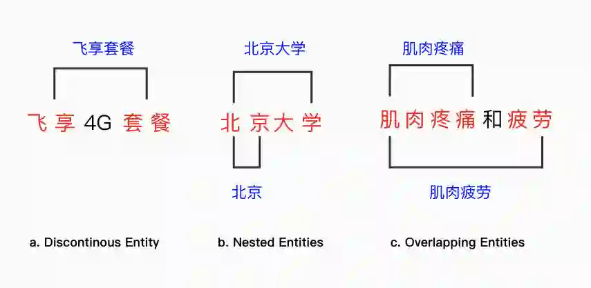 前述模型主要针对连续实体的抽取进行建模,在实际应用中还存在部分复杂实体的识别问题。这里的复杂指的是存在不连续的单实体以及多实体之间的覆盖和交叉关系。下图分别给出不连续实体(discontinuous entity),嵌套实体(nested entities)和 交叉实体(overlapping entities)的例子。
