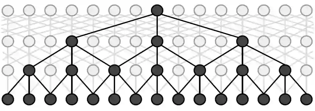 较新的,ID-CNNs [22] 利用 dilated CNN 模型(见下面示意图)解决了原本 CNN 感受野随着卷积层数的线性增长性的局限性,从而扩大了 Encoder 的感受野,进而能整合与利用更加长程的信息进行预测。
