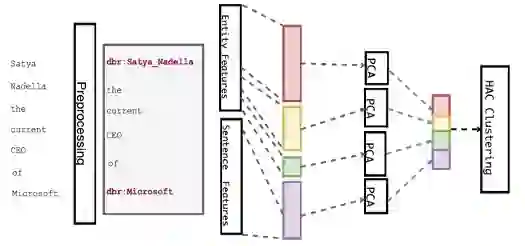 DRWE [7] 模型(见下图)采用无监督的方法进行开放关系识别。具体来说,其利用一些已有的工具识别出句子中的关键实体与实体对以及最短依存路径,之后结合预训练的词向量、实体对之间的最短依存路径和实体类型构建特征向量并进行 PCA 降维,进而通过层次聚类得到最终的关系聚类结果。