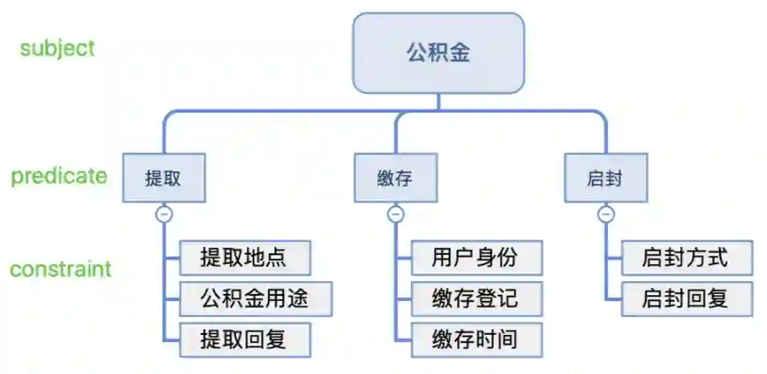在基于知识图谱的问答(KBQA)中,我们实现了基于问句的半自动 schema 构建。以公积金场景为例,下图展示了公积金图谱 schema 的一部分,算法做的是从用户的大量问句中抽取“公积金”为 subject,“缴存”、“提取”、“启封”为 predicate。