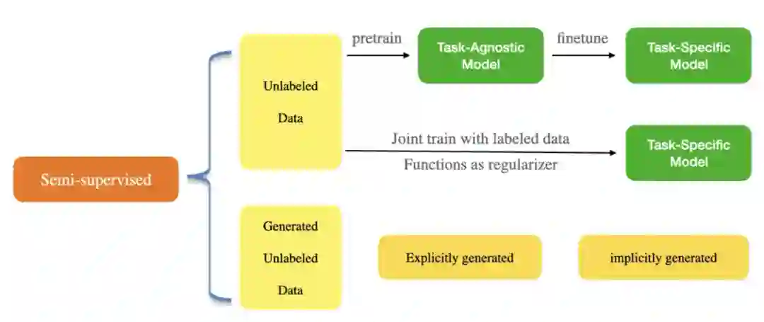 半监督算法旨在在有标签和无标签的数据集上对模型进行建模(整体模型分类见下图)。利用无标记数据进行神经网络半监督学习,在 NER 领域中得到了广泛的研究。