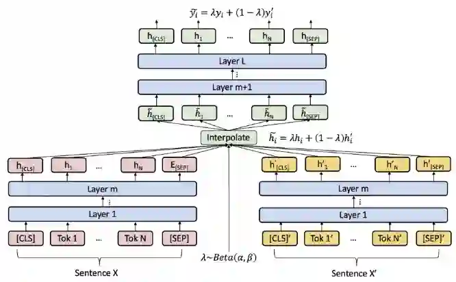 更多的,LADA [31] 将图像领域中用于数据增强的 Mixup 方法引入到 NER 中来。Mixup 方法的核心在于对特征向量进行插值,从而得到新的训练数据。由于 NER 属于序列标注问题,因此需要合理的设计多个 token 的的隐向量的插值方式。LADA [31] 采用将原句子 token 序列进行重新排列组合以及对训练句子集进行 KNN 聚类的方式,得到了句内和句间两种插值方式,实验证明这种插值方式在 NER 上是有效果的。