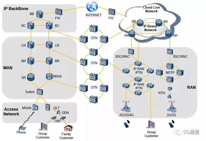 虽然我们从1G开始,历经2G、3G,一路走到4G,号称是技术飞速演进,但整个通信网络的逻辑架构,一直都是:手机→接入网→承载网→核心网→承载网→接入网→手机。