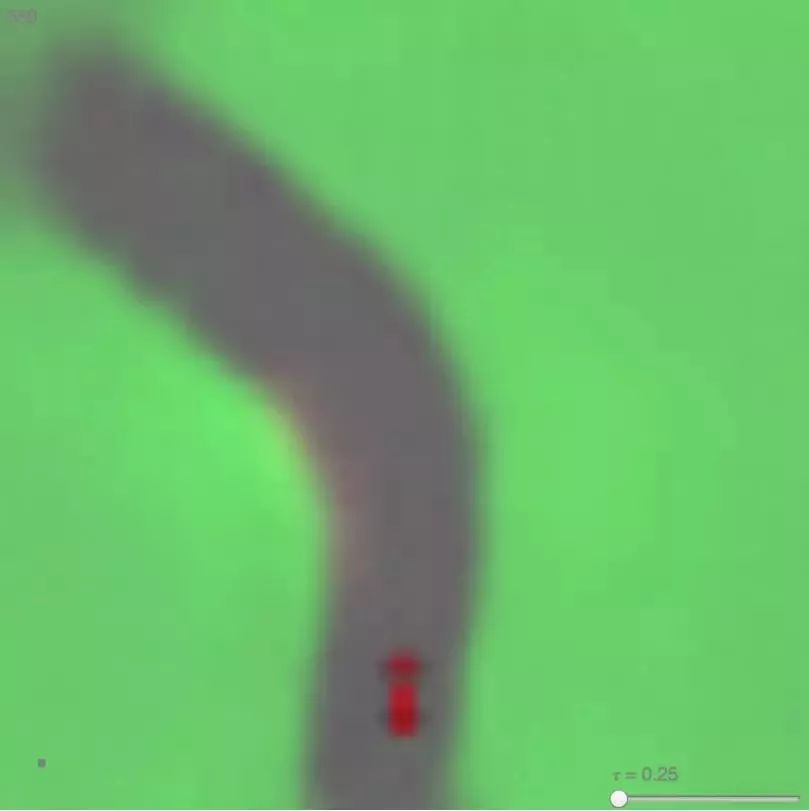 图 13:我们的智能体在自己的预想环境或「梦」中学习驾驶。在这里,我们将已训练策略部署到从 MDN-RNN 生成的伪造环境中,bintonggu 并通过 VAE 的解码器展示。在演示中,我们可以覆盖智能体的行动并调整τ以控制由 M 生成环境的不确定性。