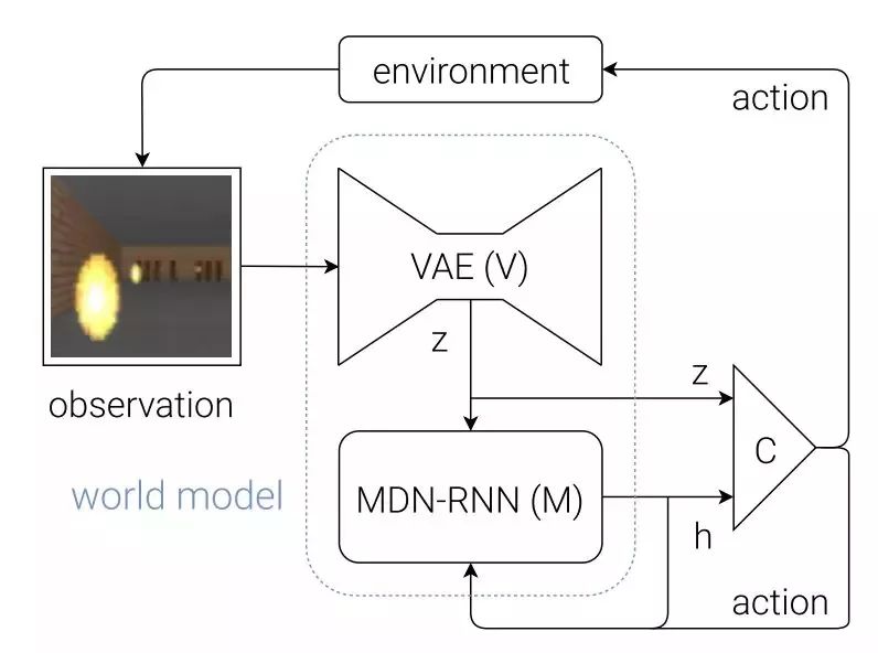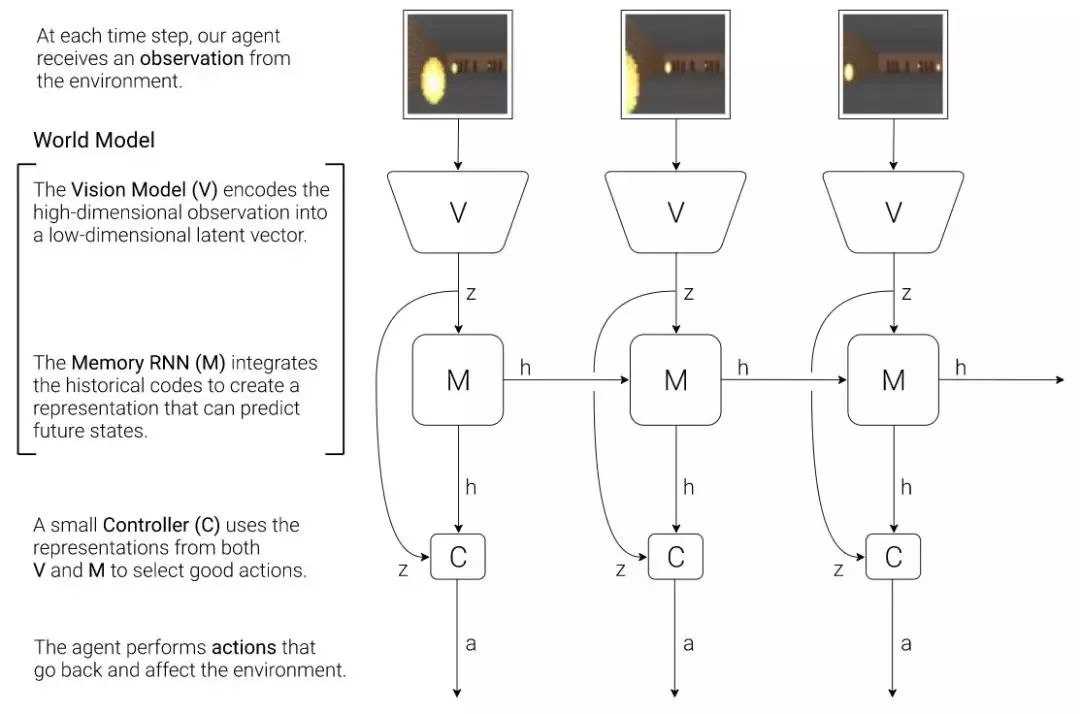 图 8:智能体模型的流程图。原始的观察每个时间步 t 到 zt 首先在 V 上进行处理。C 的输入是隐向量 zt 在每个时间步上与 M 隐藏态的串接。随后 C 会输出动作矢量以控制 motor,这会影响整个环境。随后 M 会以 zt 作为输入,生成时间 t+1 的状态 ht+1。