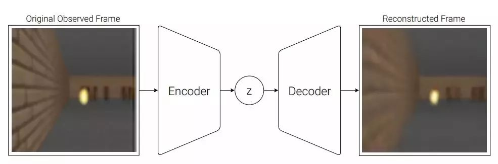 环境在每一时间步上为我们的智能体提供一个高维输入观测,这一输入通常是视频序列中的一个 2D 图像帧。VAE 模型的任务是学习每个已观测输入帧的抽象压缩表征。