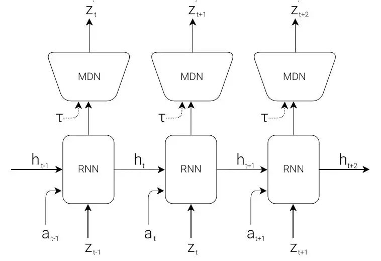 3. 训练 MDN-RNN(M)建模概率分布 P(z_{t+1} | a_t, z_t, h_t)。