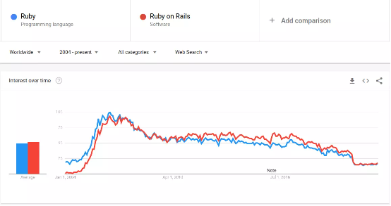 先看 Google Trends,虽然不太科学、但至少能说明一点问题。无论是 Ruby 还是 Ruby on Rails,多年来在 Google Trends 都处于一路走低的状态。