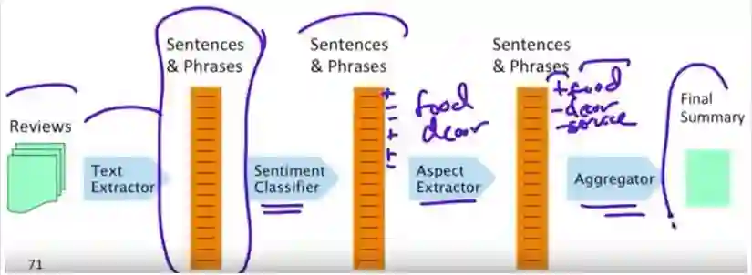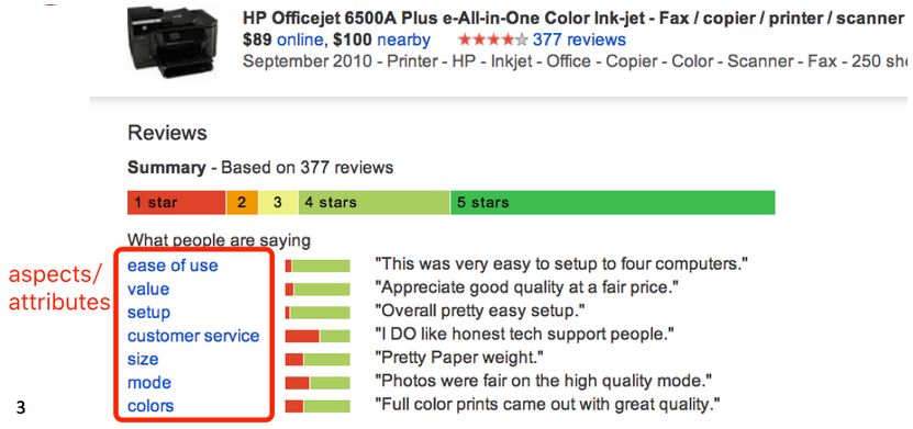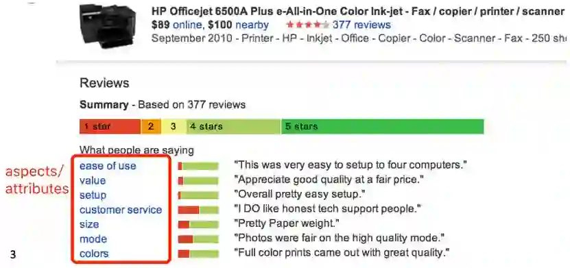 对一些领域如 restaurants/hotels 来说,aspects 比较规范,所以事实上可以人工给一些产品评论标注 aspect(aspects 如 food, décor, service, value, NONE),然后再给每个句子/短语分类看它属于哪个 aspect。