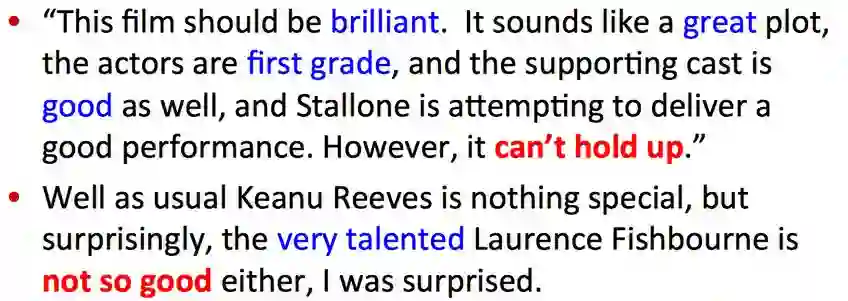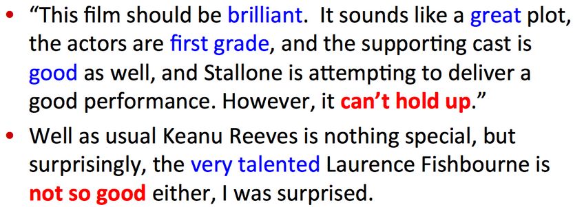 还有一个问题是排序问题(Order effect),尽管前面堆砌了很多情感词,但最后来个全盘否定,显然 Naive Bayes 没法处理这种问题