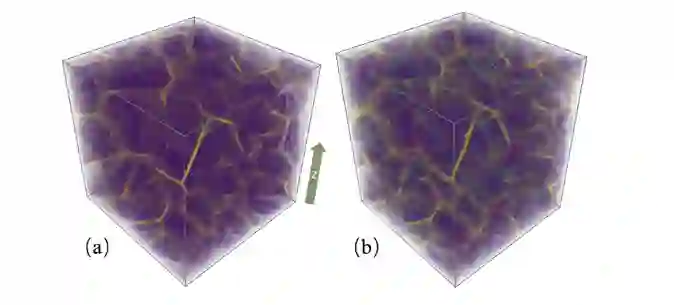 铜纳米晶粒(包含一千万个原子以上)的拉伸模拟。(a)具有面心立方晶体结构的铜原子(紫色),晶界原子(黄色)。(b)沿z轴拉伸10%后的铜纳米晶粒产生位错结构(青色)