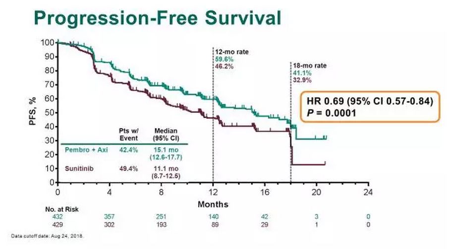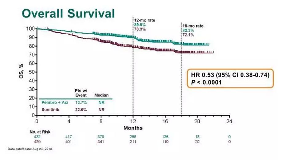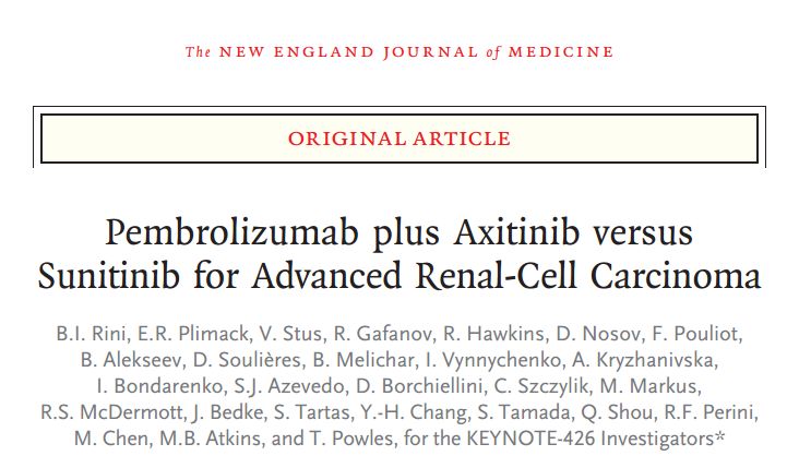 与舒尼替尼相比,帕博利珠单抗联合阿昔替尼显著改善了先前未经治疗的晚期或转移性肾透明细胞癌患者的总生存、无进展生存和客观缓解率,同时具有可控的安全性。这些数据表明,帕博利珠单抗联合阿昔替尼应成为转移性肾透明细胞患者新的标准治疗方案。