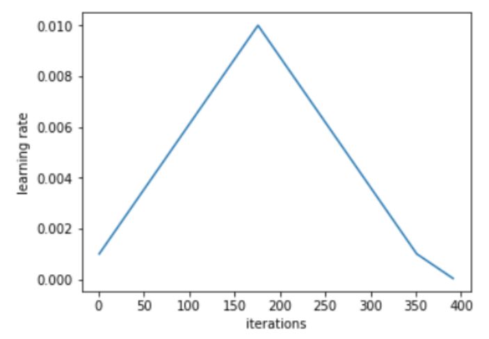 Leslie 建议,用两个等长的步骤组成一个 cycle:从很小的学习率开始,慢慢增大学习率,然后再慢慢降低回最小值。最大学习率应该根据 Learning Rate Finder 来确定,最小值则可以取最大值的十分之一。这个 cycle 的长度应该比总的 epoch 次数略小,在训练的最后阶段,可以将学习率降低到最小值以下几个数量级。
