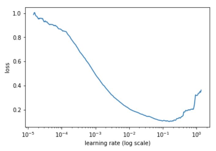 可以通过这篇文章学习如何实现 Learning Rate Finder,这里简述如下:在开始训练模型的同时,从低到高地设置学习率,直到损失(loss)变得失控为止。然后将损失和学习率画在一张图中,在损失持续下降、即将达到最小值前的范围上取一个值作为学习率。下例中,可以在 10^-2 到 3×10^-2 之间任意取一个值。