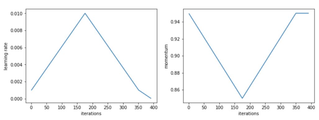 Leslie 在实验中还发现,在增大学习率的同时降低动量,可以得到更好的训练结果。这也印证了一个直觉:在训练中,我们希望 SGD 可以迅速调整到搜索平坦区域的方向上,因此就应该对新的梯度赋予更大的权重。Leslie 建议,在真实场景中,可以选取如 0.85 和 0.95 的两个值,在增大学习率的时候,将动量从 0.95 降到 0.85,在降低学习率的时候,再将动量重新从 0.85 提升回 0.95。