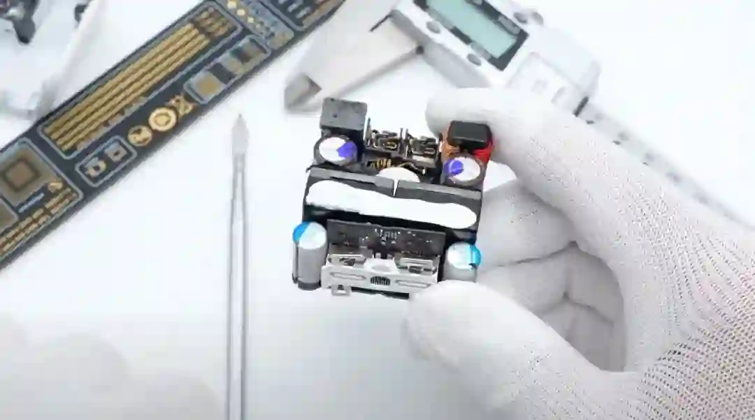 ChargerLab在将其拆解后透露,适配器使用夹子连接印刷电路板模块,以及顶部的定制部分以将其固定到位。散热垫也被隐藏起来,帮助在负载下冷却适配器。