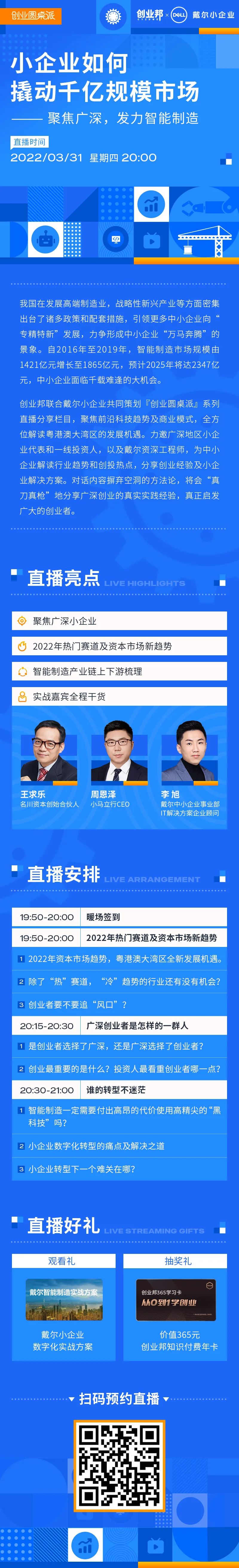 2022年3月31日20:00-21:00,创业邦与戴尔联手,共同策划「创业圆桌派」直播栏目,将针对智能制造产业链上下游,聚焦产业发展领跑全国的广深地区,从投资人、创业者、戴尔企业顾问三方视角进行分析,围绕创投趋势、创业思考、数字化转型小企业成功案例等展开话题。
