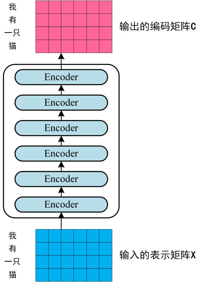 将第一步得到的向量矩阵传入编码器,编码器包含 6 个 block ,输出编码后的信息矩阵 C。每一个编码器输出的 block 维度与输入完全一致。