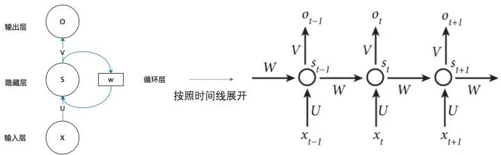 从上图可以看出,Sn 时刻的值和上一时刻 Sn-1 时刻的值相关。将 RNN 以时间序列展开,可得到下图: