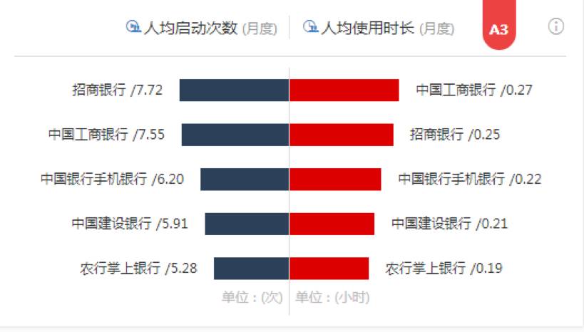 招商银行和农行掌上银行均进入2000万月活用户俱乐部。其中,招商银行的2326.07万和农行掌上银行的2309.55万月活差距微小,只是在用户月启动次数上,招商银行达到了7.72次,和农行掌上银行的5.28次差距明显。中国银行手机银行以1034.08万进入千万月活。