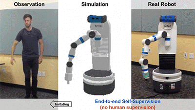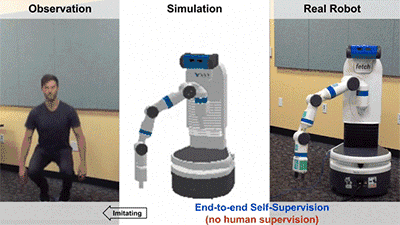 当我们的模型同时观察人类和机器人的动作,进行训练时,即使没有提供任何对应关系,它也可以自然地发现两者之间的对应。于是,我们获得了一种机器人,不需要提前知道人与机器人之间的对应关系,就能模仿人的姿势。