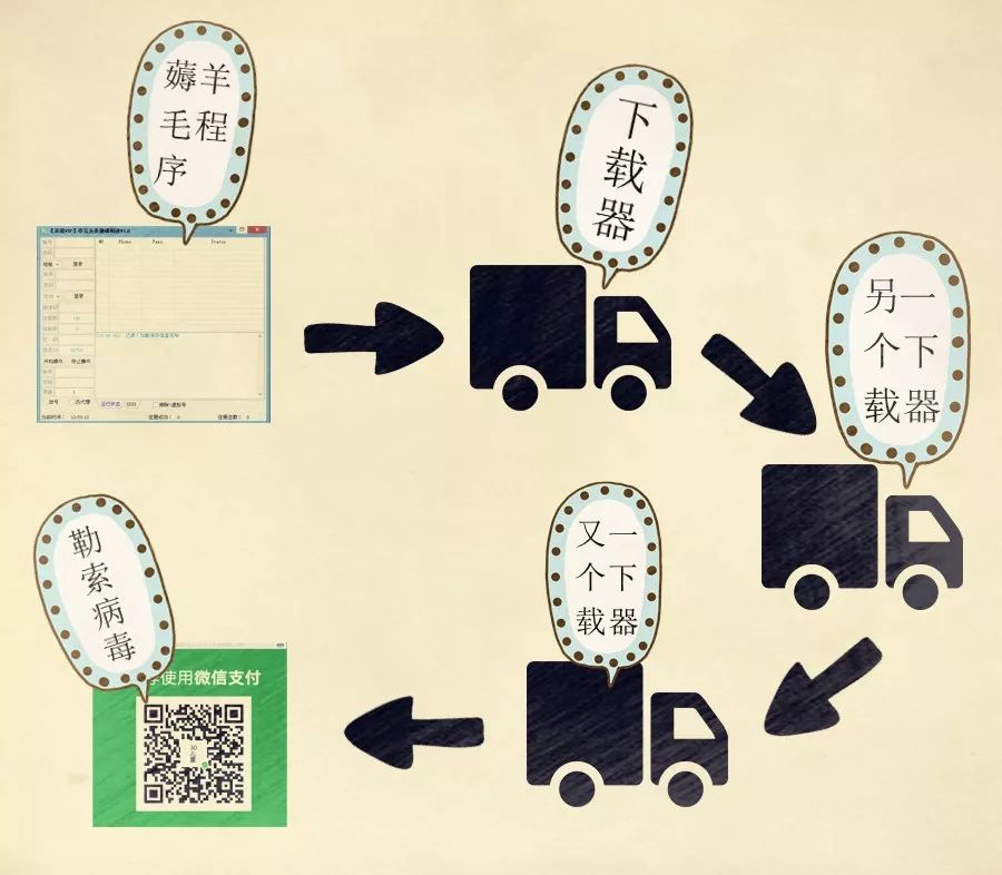 以防你没明白,中哥画张图。简单来说就是薅羊毛程序下载了一串下载器,最后一个下载器下载了勒索病毒。