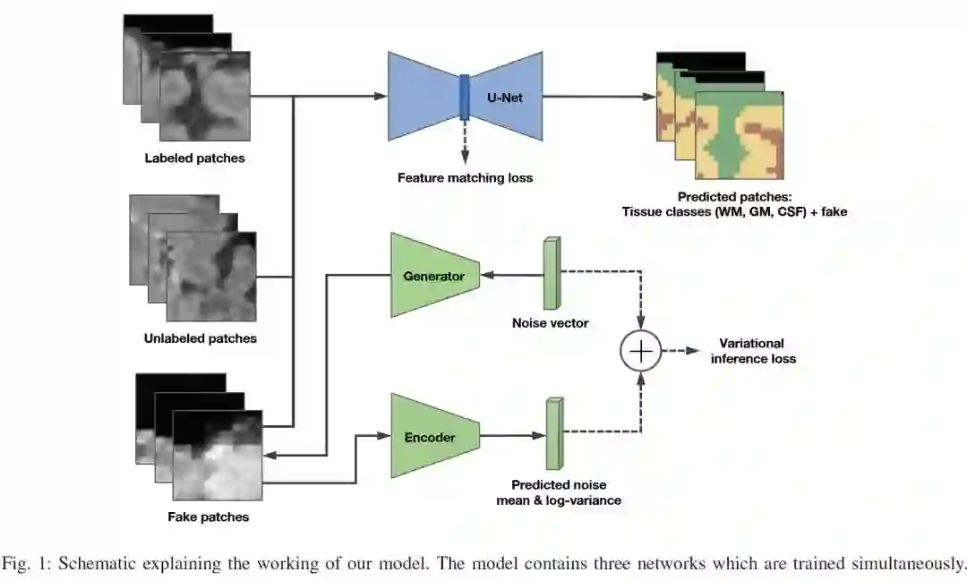 摘要:我们解决了在极少数标记示例可供训练的情况下分割三维多模态医学图像的问题。利用最近成功的对抗学习进行半监督分割,我们提出了一种基于生成对抗网络(GAN)的新方法来训练具有标记和未标记图像的分割模型。该方法通过学习识别生成网络中获得的真假patch,来防止过拟合。我们的工作扩展了目前的专注于二维单模态图像对抗性学习方法到更具挑战性的三维体多模态。针对iSEG-2017和MRBrainS 2013数据集的脑MRI分割问题,对该方法进行了评估。与在完全监督下训练的最先进的分割网络相比,性能有了显著的提高。此外,我们的工作提供了对半监督分割的不同GAN架构的综合分析,显示了最近的技术,如特征匹配,以产生比传统对抗训练方法更高的性能。我们的代码可以通过https://github.com/arnab39/FewShot_GAN-Unet3D公开获取。