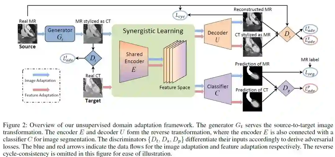 摘要:本文提出了一种新的无监督域自适应框架——协同图像与特征自适应(SIFA),有效地解决了domain shift问题。域自适应是近年来深度学习研究的一个重要和热点问题,其目的是解决神经网络应用于新的测试领域时性能下降的问题。我们提出的SIFA是一个优雅的学习图,它从图像和特征两个角度展示了适应性的协同融合。特别是,我们同时跨域转换图像的外观并且增强所提取的特征的域不变性来进行分割任务。在端到端学习过程中,特征编码器层由两个透视图共享,以掌握它们的共同特征。在不使用目标域的任何标注的情况下,我们的统一模型的学习是以对抗性损失为指导,从各个方面使用多个判别器。我们已经通过对心脏结构的跨模态医学图像分割这一具有挑战性的应用广泛地验证了我们的方法。实验结果表明,我们的SIFA模型能够将性能下降幅度从17.2%恢复到73.0%,并显著优于现有的最先进方法。