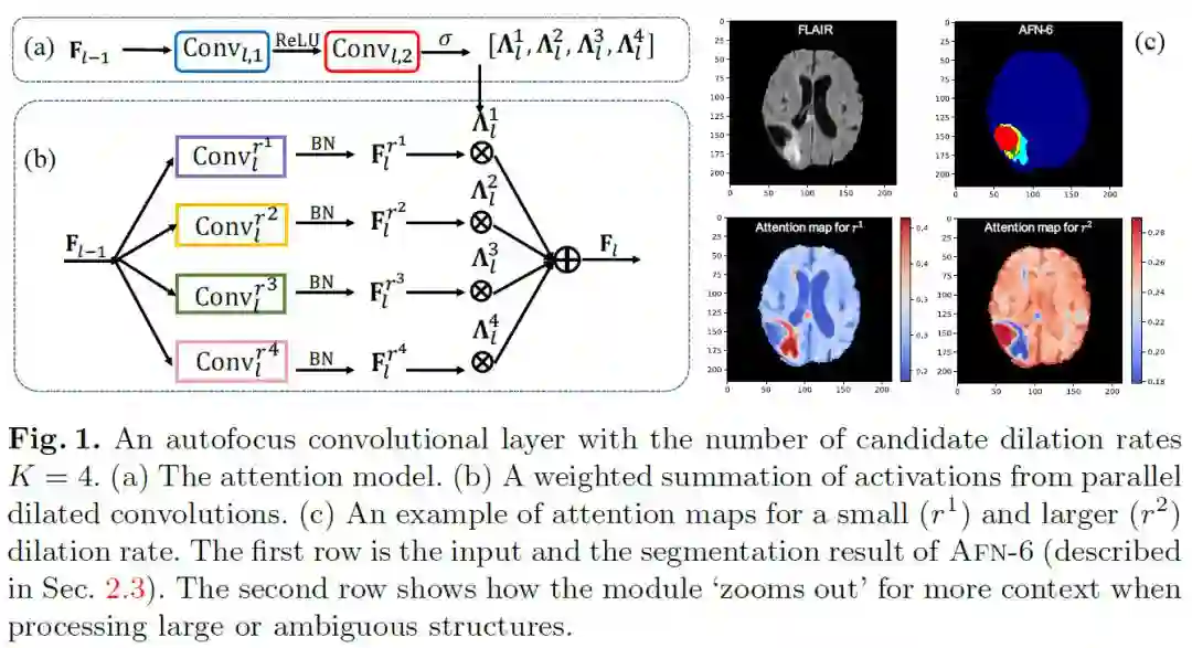 摘要:为了提高神经网络的多尺度处理能力,提出了一种自聚焦卷积层用于语义分割。自动聚焦层根据处理过的上下文自适应地改变有效接受域的大小,以生成更强大的特征。这是通过将具有不同膨胀率的多个卷积层并行化来实现的,并结合一种注意力机制,该机制学会将注意力集中在由上下文驱动的最优尺度上。通过共享并行卷积的权值,我们使网络的规模不变,只增加了少量的参数。提出的自动聚焦层可以很容易地集成到现有网络中,提高模型的表示能力。我们在骨盆CT多器官分割和MRI脑肿瘤分割的挑战性任务中评估了我们的模型,并取得了非常有前景的性能。
