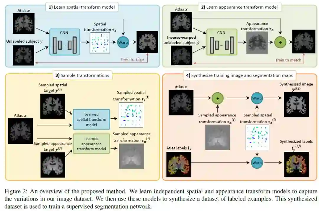 摘要:图像分割是医学应用中的一个重要课题。基于卷积神经网络的方法获得了最先进的精度;然而,它们通常依赖于带有大型标记数据集的监督训练。医学图像的标注需要大量的专业知识和时间,而典型的手工调优的数据增强方法无法捕捉这些图像中的复杂变化。我们提出了一种自动数据增强方法来合成标记医学图像。我们在分割磁共振成像(MRI)脑扫描的任务中展示了我们的方法。我们的方法只需要一次分段扫描,并利用半监督方法中的其他未标记扫描。我们从图像中学习转换模型,并使用该模型和带标记的示例来合成其他带标记的示例。每个转换都由空间变形场和强度变化组成,从而能够综合复杂的效果,如解剖学和图像采集过程的变化。我们展示了使用这些新示例训练有监督的分割器,对于one-shot生物医学图像分割的最先进方法有着显着的改进。我们的代码可以在https://github.com/xamyzhao/brainstorm上找到。
