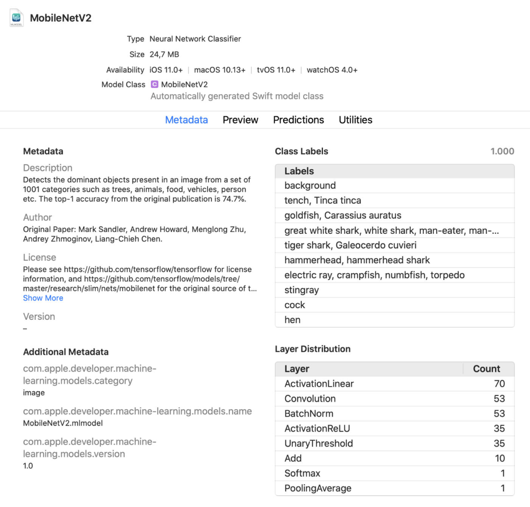 Xcode 现在可以显示关于模型的更多信息了,比如类标签和添加到模型中的任何自定义元数据。它还显示了模型中关于层类型的统计信息。